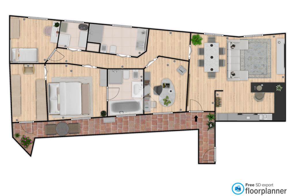 Accedendo all’immobile si entra subito nella zona giorno con comoda cucina a vista angolare; tramite corridoio entriamo nel reparto notte così composto: un funzionale studio utilizzabile come terza camera, due camere da letto delle quali una matrimoniale con bagno privato e cabina armadio e l’altra singola. Completano la zona notte un secondo bagno finestrato completo con doccia ed un comodo locale lavanderia con finestra. Il lungo balcone di ringhiera abbraccia tutta la casa ed è utilizzato solo dalla proprietà.