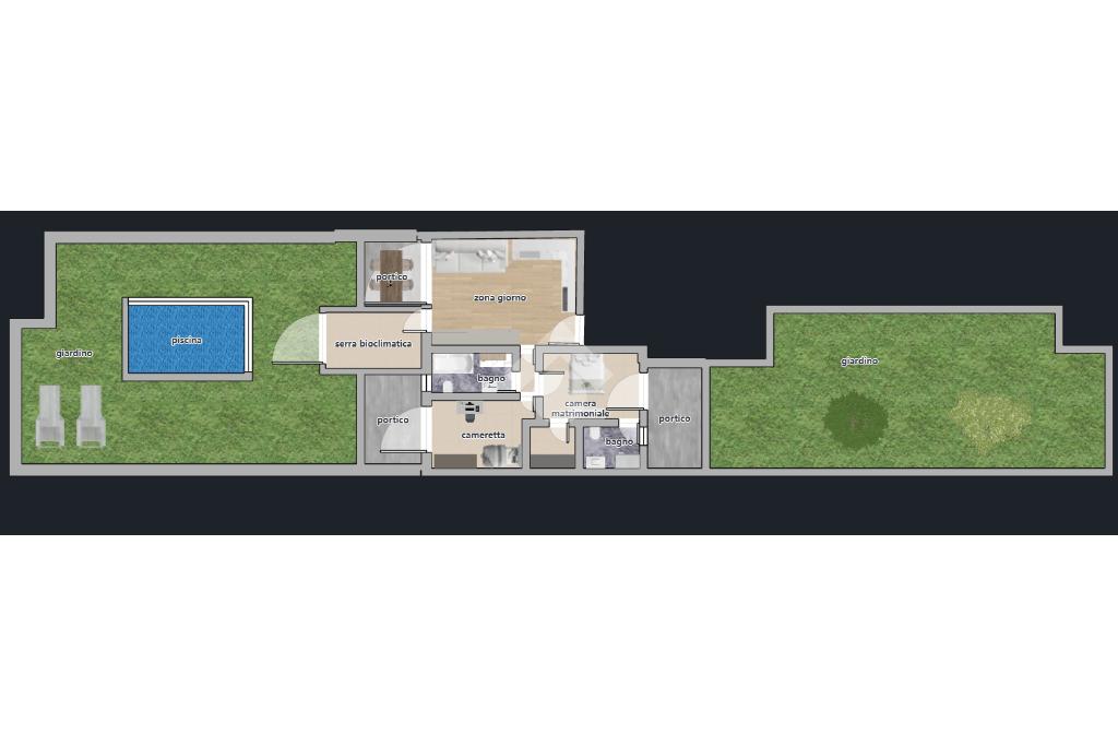 L’immobile gode di un ampio giardino disposto su due lati, arricchito da portici coperti che offrono piacevoli spazi ombreggiati e da una suggestiva piscina privata interrata, dalle dimensioni di 5 metri per 3,5 con una profondità di 1,25 metri.