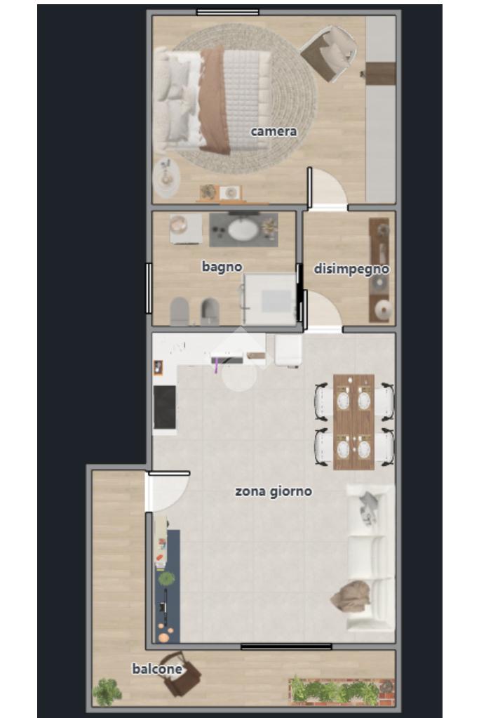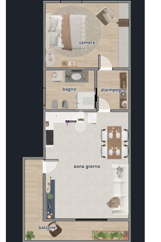 L’abitazione si compone di un luminoso soggiorno con angolo cottura, valorizzato da un’ampia porta finestra che garantisce grande luminosità e consente l’accesso al balcone, ideale per momenti di relax all’aperto.